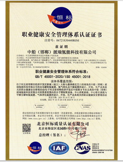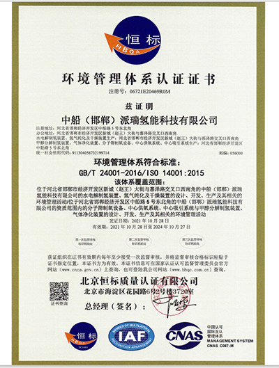 中國船舶重工集團公司第七一八研究所1998年通過GB/T19001質量體系認證,2005年通過中國質量認證中心的CCC認證,2008年通過環境和職業健康安全管理體系認證,實施QEO一體化管理。是世界較大的制氫研究、生產基地。